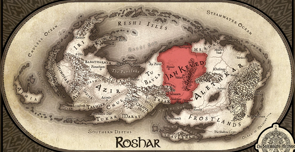 Jah Keved is one of the five Vorin kingdoms, west of Alethkar. Its capital is Vedenar. It is also the second-largest kingdom on Roshar.[1] During the Heraldic Epochs, the region was part of the former kingdom Valhav.