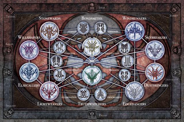 From the outermost ring inward: Surges, orders of Knights Radiant, Spren and associated Heralds.